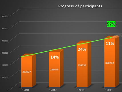 This is an increase of approximately 40 000 participants, or an increase with 11%, compared with last years World Orienteering Day.